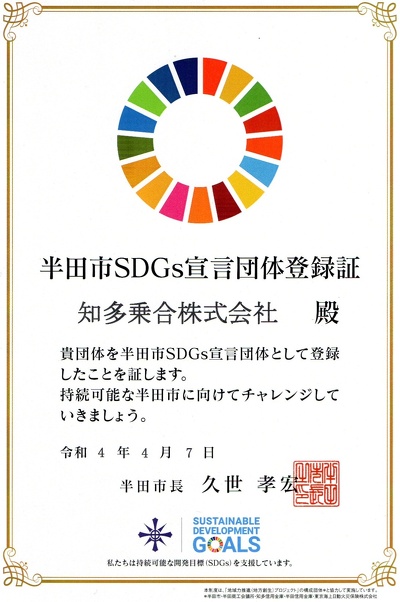 半田市よりSDGs宣言団体登録証をいただきました。 ありがとうございます。 知多バスのSDGsの取組みについては こちら